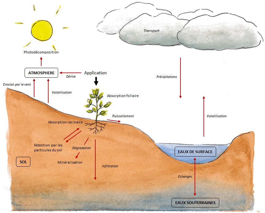 Le devenir des produits phytosanitaires dans l’environnement dépend de plusieurs critères : procédé de pulvérisation utilisé, propriétés physico-chimiques des molécules et du milieu etc. De plus, les mécanismes gouvernant la circulation des substances actives sont nombreux (volatilisation, lessivage, sorption etc.) et complexes car en constante interaction. Tous ces mécanismes vont à terme contribuer à l’accumulation des substances actives phytosanitaires et/ou de leurs molécules de dégradation dans les eaux.