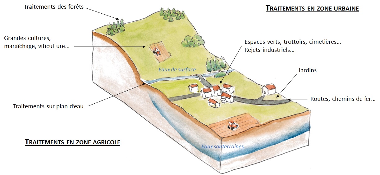 Les produits phytosanitaires peuvent être utilisés en agriculture, pour l’entretien de certains espaces urbanisés, pour la gestion des maladies et des ravageurs au potager… Les sources potentielles de contamination sont donc nombreuses (voir schéma ci-après) et tous les utilisateurs de ces produits sont susceptibles de contribuer à la pollution de notre environnement.